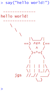 近日發現有趣的 cowsay 套件, cowsay 是產生ASCII圖片的程式並可顯示一頭牛的訊息 (https://zh.wikipedia.org/wiki/Cowsay)。cowsay 套件內建34種ASCII圖片, 參考以下範例: