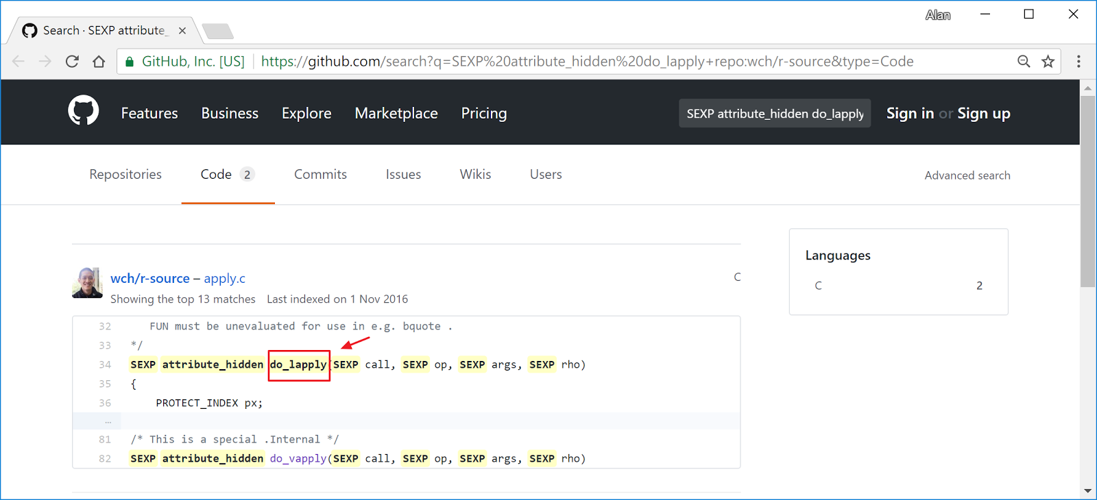getAnywhere {utils} 可查詢函數隸屬於哪些套件與內容. 使用 show_c_source {pryr}可檢視該函數原始檔.