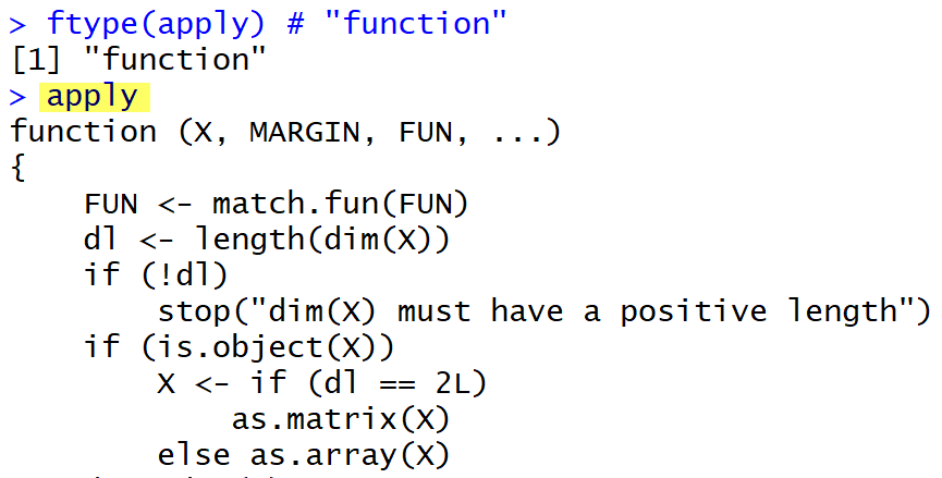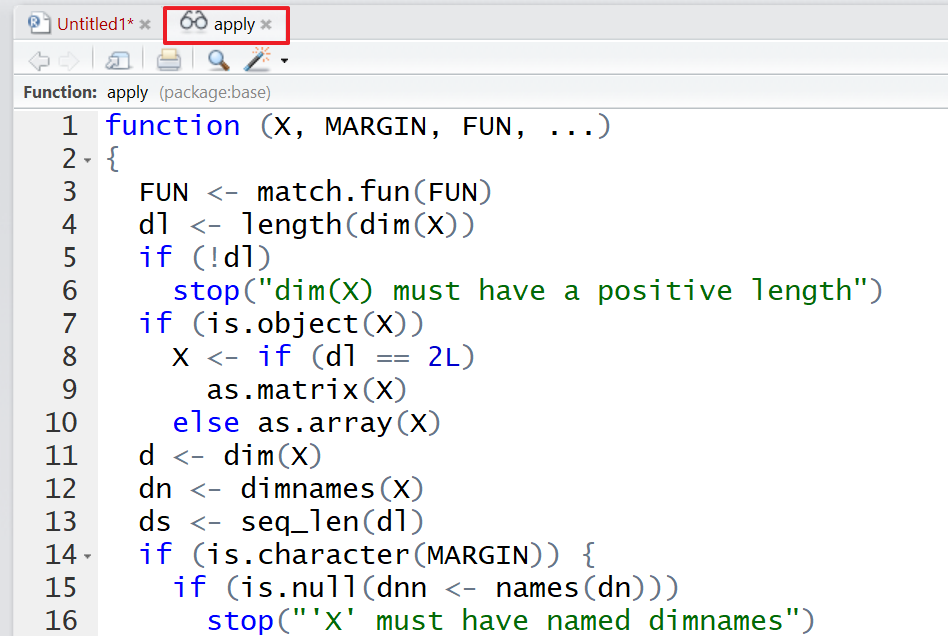 在 RStuido 軟體的程式編輯視窗, 選取 apply , 按 CTRL + 滑鼠左鍵, 可開啟原始檔.