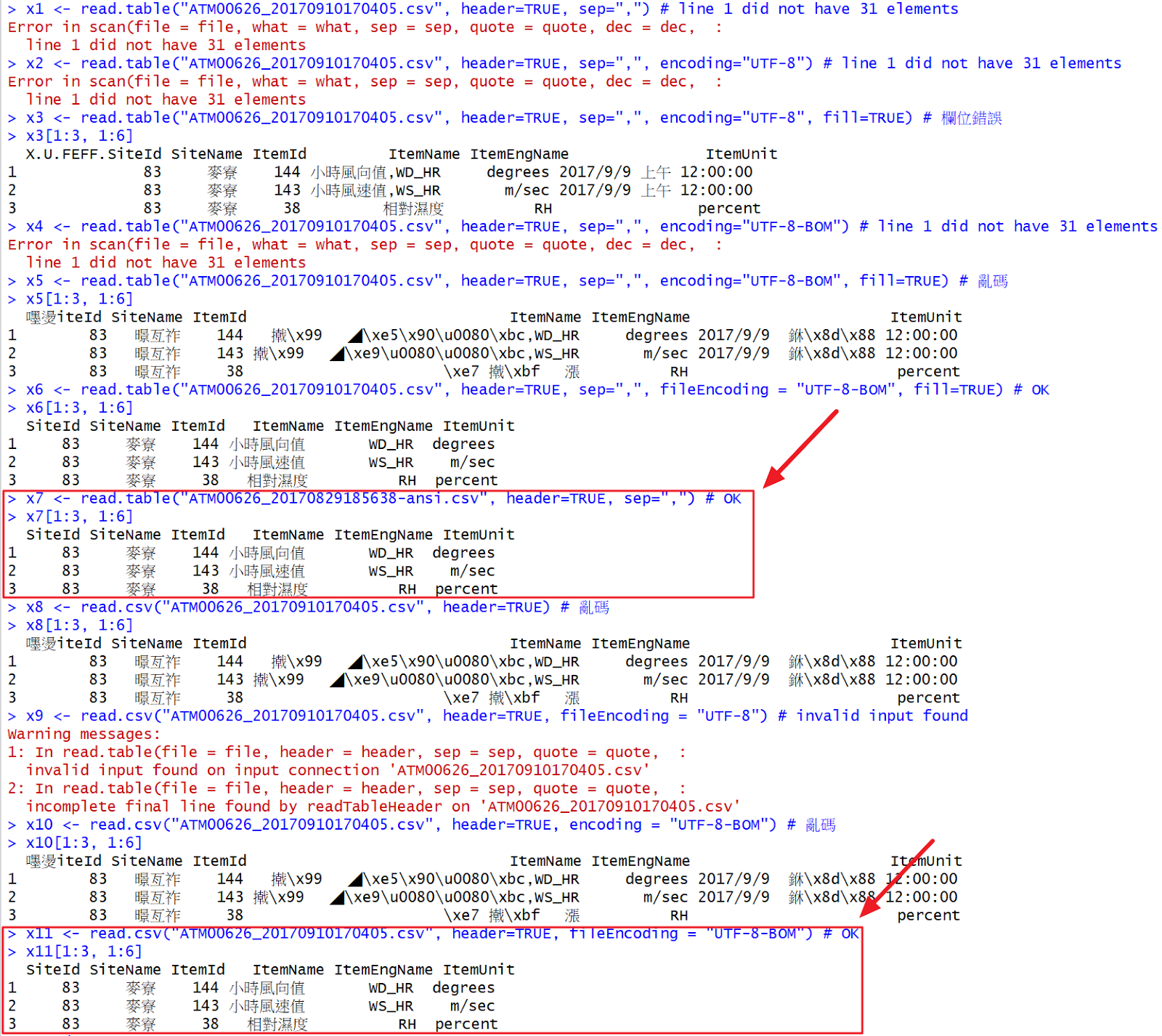 x5 <- read.table("ATM00626_20170910170405.csv", header=TRUE, sep=",", encoding="UTF-8-BOM", fill=TRUE) # 亂碼