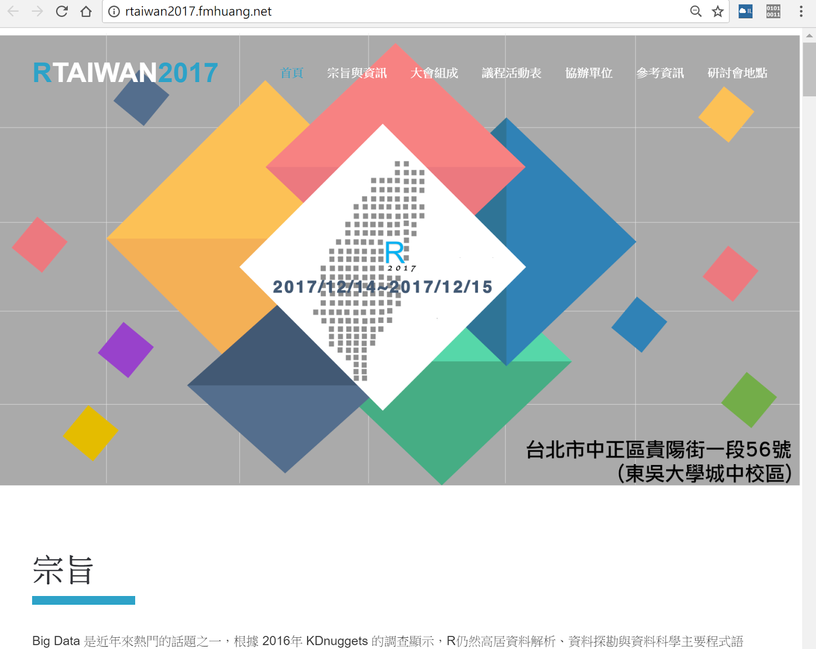 會議主軸:資料融合、分析與應用 (不限定R語言)會議地址:台北市中正區貴陽街一段56號 (東吳大學城中校區)